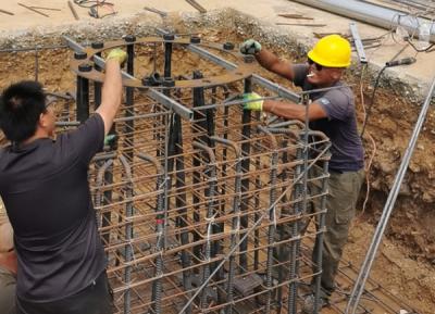 萊陽收費站天棚獨立基礎鋼筋安裝和鋼柱預埋地腳螺栓安裝